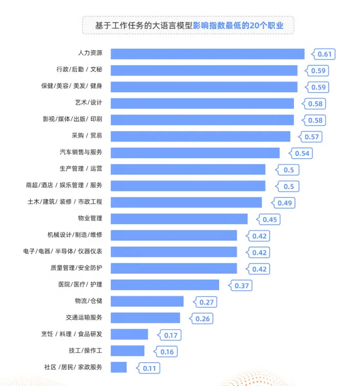 影响最低的职业,反而是人力资源、行政/后勤/文秘、美发健身、艺术设计等,往往是跟人打交道,或者与审美、艺术有关的岗位。